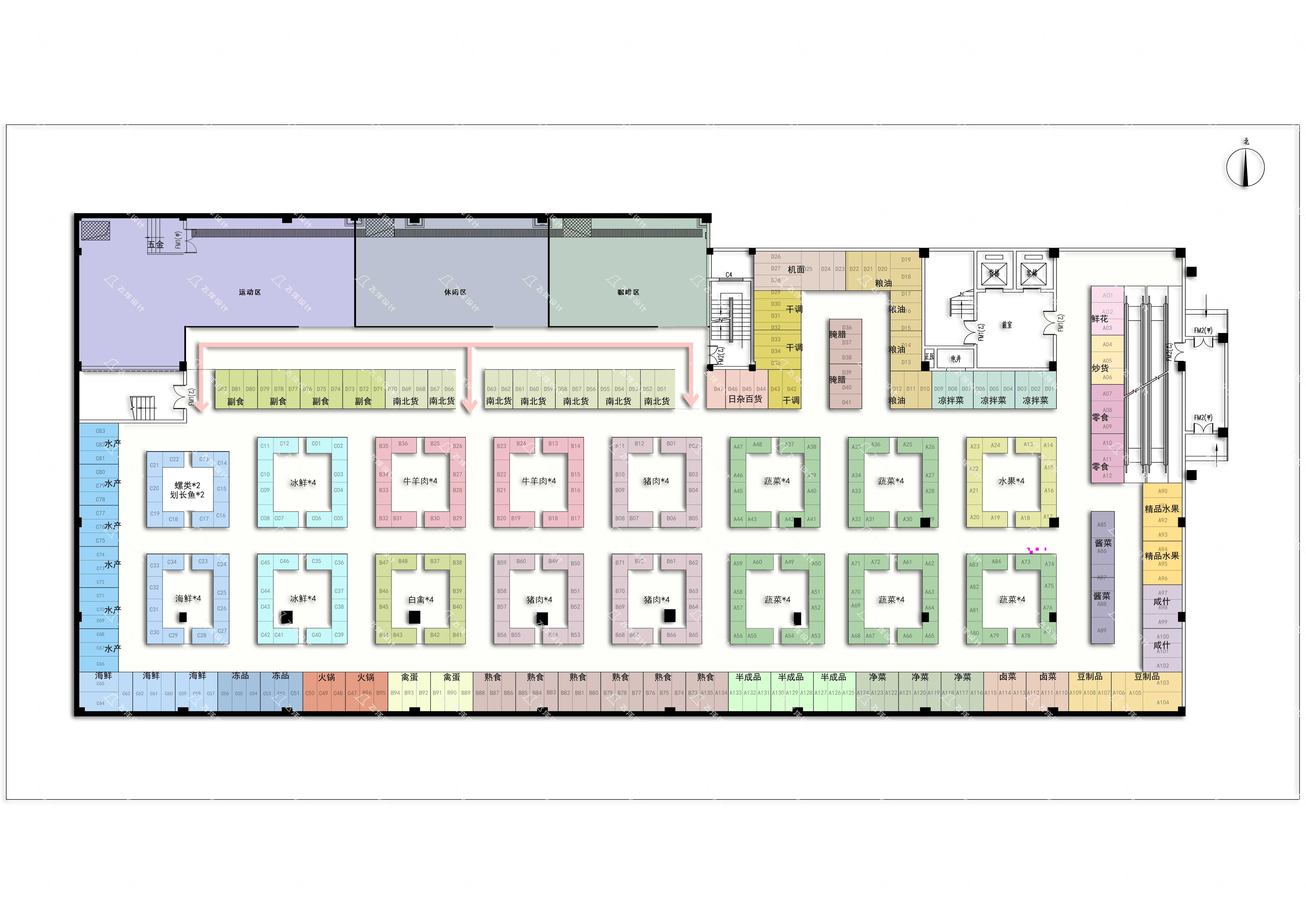 采用色彩編碼系統(tǒng),清晰劃分果蔬、水產(chǎn)、肉類等不同業(yè)態(tài)區(qū)域