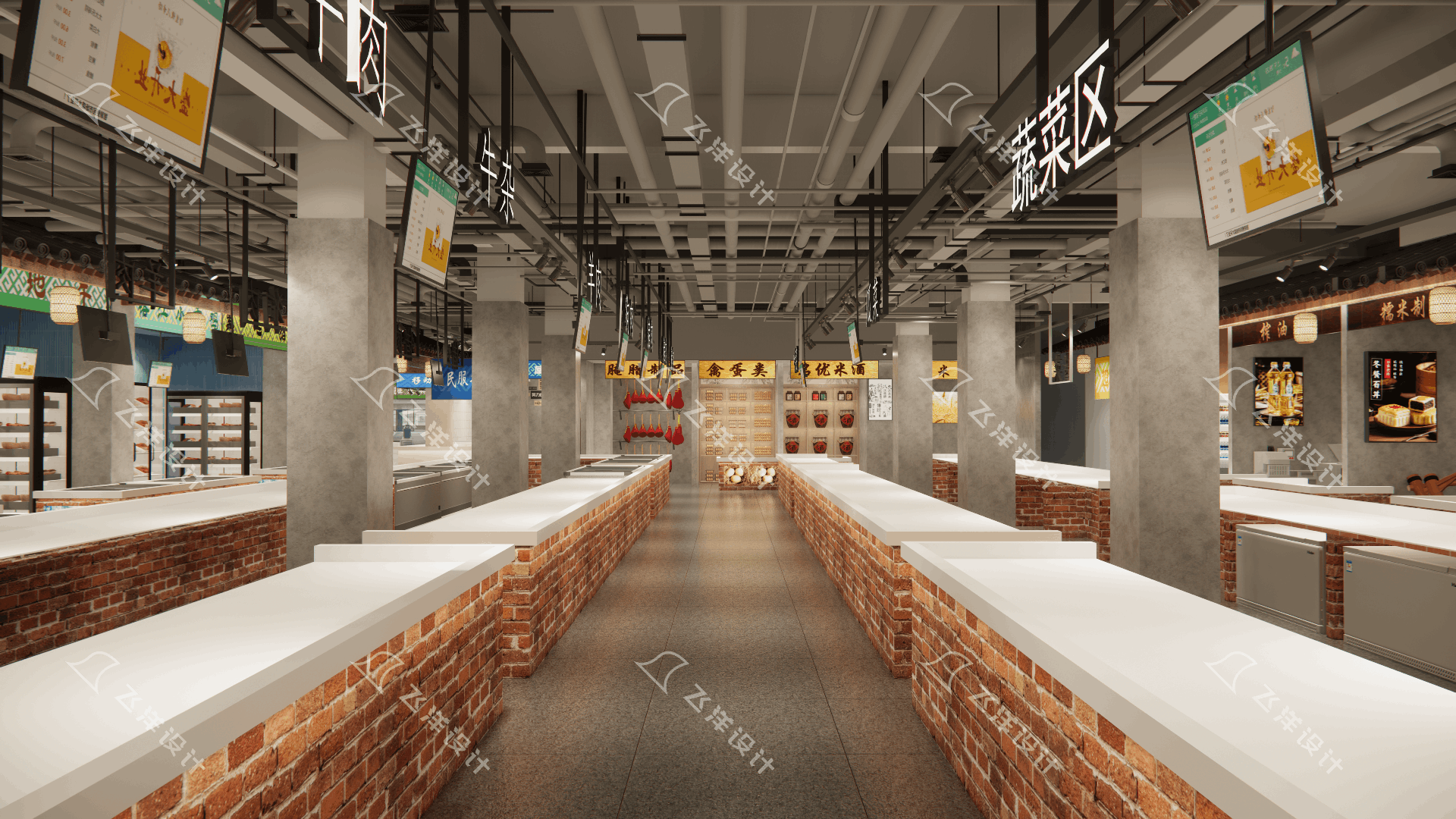 黔山市集原址為貴州凱里三商場(chǎng)半地下室空間,前門(mén)位于負(fù)一層,后門(mén)連通地面一層,是連接城市不同標(biāo)高的特殊商業(yè)體。本次改造以亮點(diǎn)吸引直達(dá)動(dòng)線(xiàn)、規(guī)避半地下室交通閉塞為主要矛盾解決思路,以"胖東來(lái)"服務(wù)理念與品質(zhì)標(biāo)準(zhǔn)為藍(lán)本,深度融合黔東南苗族侗族文化元素,通過(guò)品牌化、精品化、體驗(yàn)化的全面升級(jí),打造集在地農(nóng)產(chǎn)品展銷(xiāo)、民族手作體驗(yàn)、特色美食加工于一體的區(qū)域性農(nóng)貿(mào)標(biāo)桿,讓傳統(tǒng)市集成為展示貴州風(fēng)物的重要平臺(tái)。