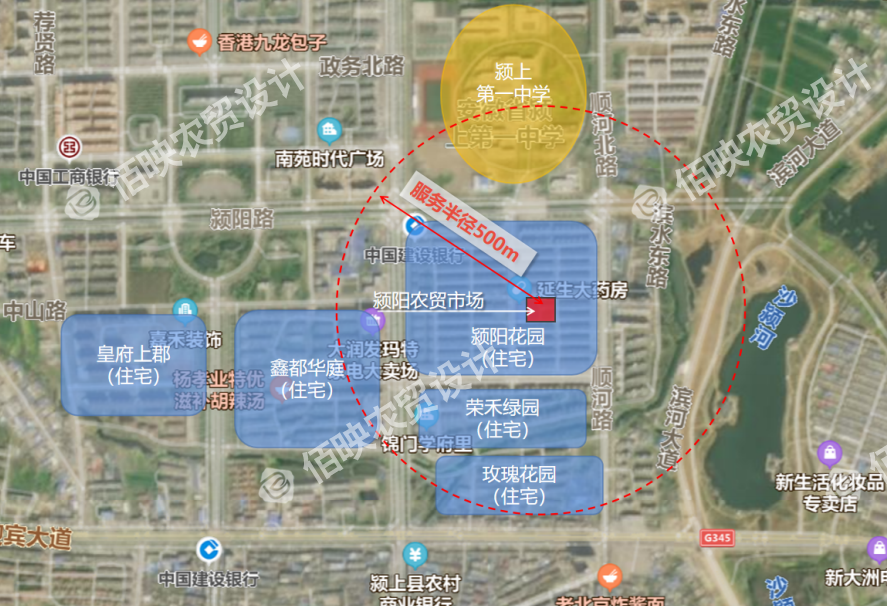 潁陽市場位于安徽省阜陽市潁上縣中部,中山路與解放路交叉口,潁陽是花園小區(qū)內(nèi)的社區(qū)配套型市場。社區(qū)配套服務(wù)級農(nóng)貿(mào)市場的輻射范圍為500米,在此范圍內(nèi)有潁陽花園、榮禾綠園、玫瑰花園等住宅小區(qū)。