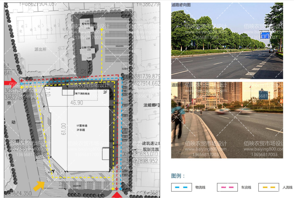 ?。▌倮麞|路市場動線,實行物流、車流、客流三者相互獨立的設計原則)