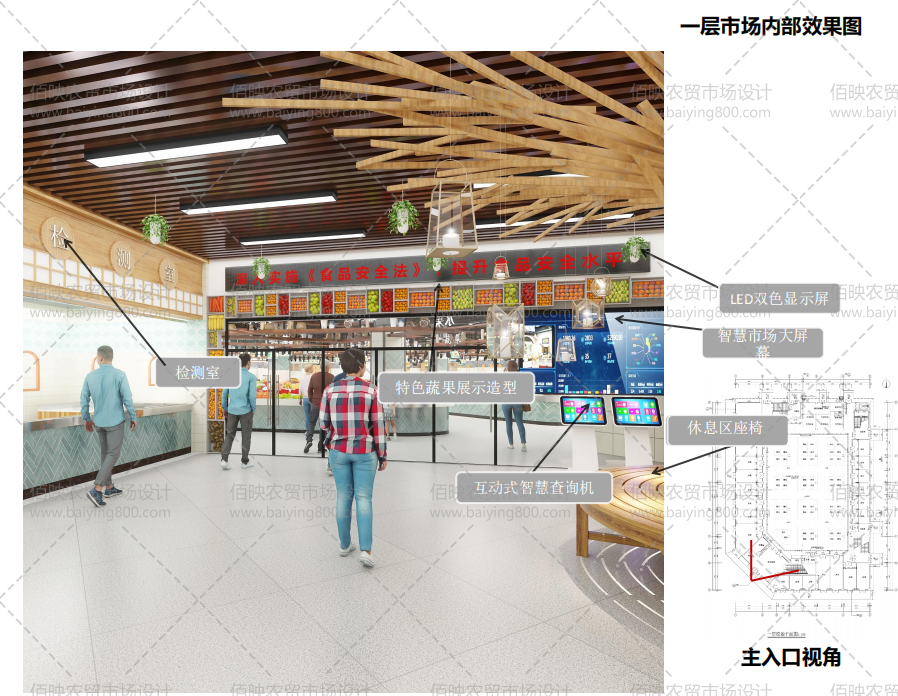 基于勝利東路市場服務人口眾多,肩負解決百姓基本生活需求的任務,佰映設計以高標準打造,讓勝利東路市場成為一個帶給百姓綠色健康的農(nóng)產(chǎn)品的標桿市場。以提高居民生活及購物品質,遠離“臟亂差”,給百姓一個“文明、舒適、放心、惠民、智慧”的示范性農(nóng)貿(mào)市場為目標,成為界首市標志性民生工程。