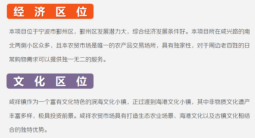 咸祥農(nóng)貿(mào)市場面積約8000平方米,地處有“海灣小鎮(zhèn)”稱謂的寧波市咸祥鎮(zhèn) ,比鄰北侖港,位于金山公園東側(cè),咸興路南,咸祥鎮(zhèn)中心區(qū)塊,周邊商業(yè)氛圍濃郁,經(jīng)營環(huán)境良好。