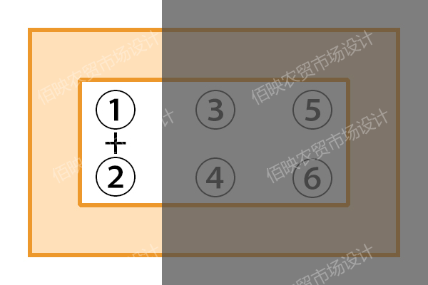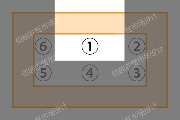 首先是“一”字型攤位單元,將整個攤島劃分為6戶后,如上圖所示,就出現(xiàn)了①④兩個“一”字形狀的單元。以①號單元為例,他的左右兩邊分別被②和⑥包圍,且后兩者的單元占據(jù)轉(zhuǎn)角,后兩者商業(yè)位置以及臺面擺放條件更具備優(yōu)勢,這樣就讓處在中間的①號單元競爭力相對薄弱,成為了無奈的選擇。