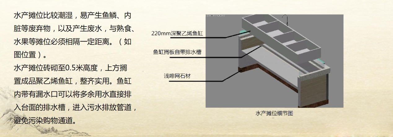水產(chǎn)攤位比較潮濕,容易產(chǎn)生魚鱗、內(nèi)臟等廢棄物,以及產(chǎn)生大量臟水,與熟食、水果等攤位必須隔離一段距離。另外來說,水產(chǎn)攤位磚必須砌到0.5米高度,上方擱置成品聚乙烯魚缸,整齊實用,魚缸內(nèi)帶有漏水口可以將多余用水直接排入臺面的排水槽,進入污水排放管道,避免污染人流主干道和購物環(huán)境。